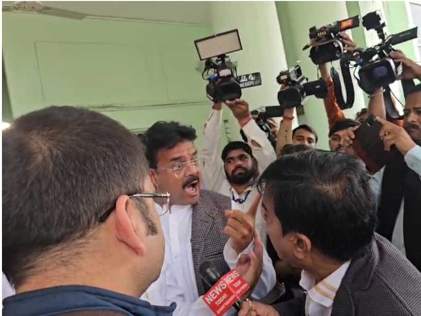 [ad_1]रायपुर। विधानसभा परिसर में शुक्रवार को कांग्रेस के विधायकों, और एक पत्रकार सुनील नामदेव की खूब बहस हुई। ये विवाद कैमरे पर रिकॉर्ड हो गया। विधानसभा में कानून व्यवस्था पर विपक्षी कांग्रेस सदस्यों ने स्थगन प्रस्ताव की सूचना दी थी, और फिर सदन में हंगामे के बाद कांग्रेस सदस्य बाहर चले गए। विधानसभा परिसर में गांधी प्रतिमा के सामने प्रदर्शन किया। इसी बीच नेता प्रतिपक्ष डॉ. चरणदास महंत, और पूर्व सीएम भूपेश बघेल से मीडिया कर्मियों ने चर्चा की। इसी बीच सवाल-जवाब के दौरान पत्रकार सुनील नामदेव की पहले भूपेश बघेल, और फिर कांग्रेस के विधायकों अटल श्रीवास्तव व अन्य के साथ बहस हुई। इसकी काफी चर्चा रही। [ad_2] Source link Post navigationछत्तीसगढ़: BJP ने मंडल अध्यक्षों की घोषणा की, नए चेहरों को मौका, वरिष्ठ नेता मायूस मुख्यमंत्री ने किया दैनिक जशपुरांचल की रजत जयंती स्मारिका का विमोचन