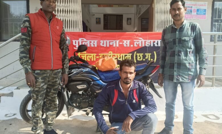 पुलिस अधीक्षक धर्मेन्द्र सिंह (भा.पु.से.) महोदय के मार्गदर्शन मे एंव अति0 पुलिस अधीक्षक  पुष्पेन्द्र बघेल, एंव श्री पंकज पटेल , पुलिस अनुविभागीय अधिकारी  प्रतीक चतुर्वेदी के दिशा निर्देशन मे थाना प्रभारी स0 लोहारा निरीक्षक मनीष मिश्रा के द्वारा थाना क्षेत्र मे लगातार अवैध गतिविधियो के विरूध्द प्रभावी कार्यवाही की जा रही है इसी क्रम मे दिनांक 19/11/25 मुखबीर सुचना पर इरीमकसा तिराहा के आगे ईरीमकसा रोड स0 लोहारा मे अवैध रूप से शराब रखकर परिवहन एंव बिक्री करने कि सुचना पर रेड कार्यवाही कर आरोपी – तोरण साहु पिता सैतु साहु उम्र 30 साल साकिन कोयलारी थाना सिंघनपुरी जंगल जिला कबीरधाम के कब्जे से एक मो0सा0 फैशन प्रो काला नीला कलर क्रमांक CG09JR9433 के डिग्गी मे रखे संतरा रंग के गमछा में रखे 19 नग BESTO RARE WHISKY मंदिरा का पौवा प्रत्येक में 180-180 एमएल भरा हुआ शीलबंद कुल 3.420 बल्क लीटर जुमला कीमती 2280 रूपये ,एंव 10 नंग रोमियो देशी मंदिरा प्लेन प्रत्येक में 180-180 एमएल भरा हुआ शीलबंद 1,800 बल्क लीटर किमती 800 रूपये कुल 5.220 बल्क लीटर पास से नगदी रकम 1230 रूपये घटना मे प्रयुक्त मोटर सायकल किमती 65000 कुल जुमला 69310 रूपये । जप्त किया गया मुताबिक गिरफ्तारी पत्रक के गिरफ्तार कर आरोपी का कृत्य धारा 34(2) आबकारी एकट का पाये जाने से थाना स0 लोहारा मे अपराध क्रमाक 260/25 पंजीबध्द कर विवेचना मे लिया गया । आरोपी को न्यायिक रिमांड पर माननीय न्यायालय कवर्धा मे पेश किया गया । लोहारा पुलिस का अभियान जारी है ।