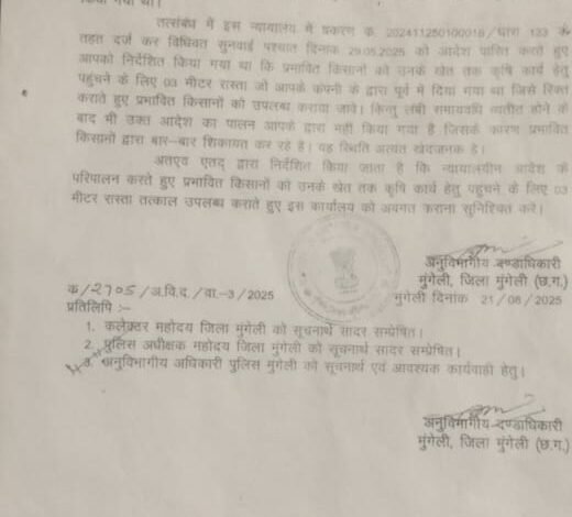 अनुविभागीय दंडाधिकारी मुंगेली द्वारा सोलर कंपनी एमप्लस हेलियोस प्राइवेट लिमिटेड, संबलपुर को किसानों के लिए अवरुद्ध किए गए मार्ग को पुनः उपलब्ध कराने हेतु कड़े निर्देश जारी किए गए हैं। मामला संहिता की धारा 133 के अंतर्गत न्यायालय में दर्ज प्रकरण से जुड़ा है, जिसमें कंपनी द्वारा कृषि भूमि तक पहुँच के लिए पूर्व में उपलब्ध कराए गए 03 मीटर चौड़े रास्ते को अवैध रूप से बाधित किया गया था।