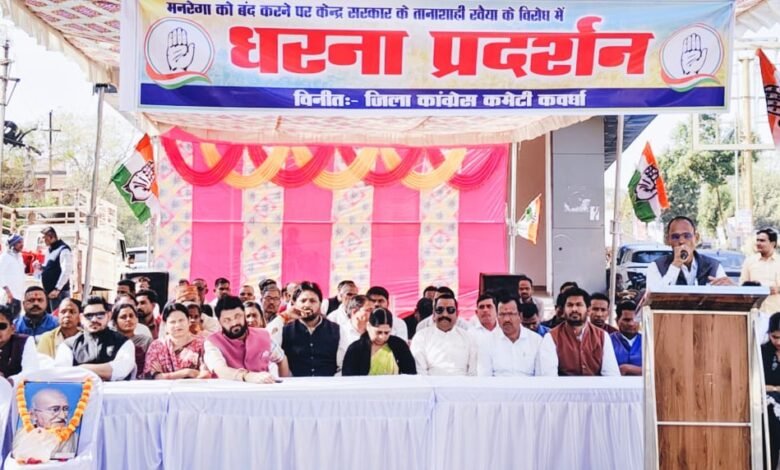 कवर्धा। जिला कांग्रेस कमेटी ने महात्मा गांधी रोजगार गारंटी योजना (मनरेगा) का नाम बदले जाने के विरोध में एकदिवसीय धरना प्रदर्शन किया। इस दौरान कांग्रेस नेताओं ने केंद्र सरकार पर आरोप लगाया कि योजना का नाम बदलकर उसे कमजोर करने की साजिश की जा रही है।