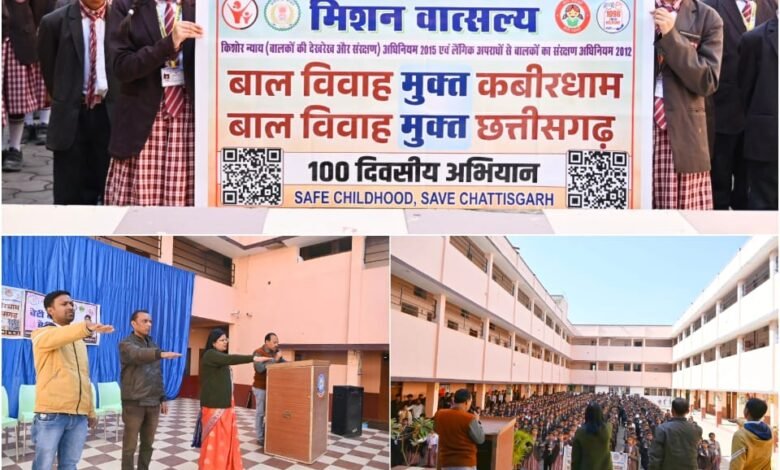 कवर्धा -: छत्तीसगढ़ शासन द्वारा संचालित 100 दिवसीय बाल विवाह रोकथाम अभियान के अंतर्गत आज शहर के प्रमुख सी.बी.एस.ई. विद्यालय श्री रामकृष्ण पब्लिक स्कूल में महिला एवं बाल विकास विभाग द्वारा जागरूकता कार्यक्रम का आयोजन किया गया। कार्यक्रम का उद्देश्य विद्यार्थियों को बाल विवाह के दुष्परिणामों से अवगत कराना तथा ‘बेटी पढ़ाओ, बेटी बचाओ’ अभियान के महत्व को रेखांकित करना रहा।