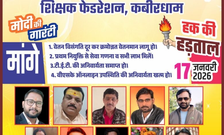 कबीरधाम। छत्तीसगढ़ सहायक शिक्षक समग्र शिक्षक फेडरेशन ने अपनी लंबित चार सूत्रीय मांगों को लेकर 17 जनवरी को एक दिवसीय हड़ताल का ऐलान किया है। फेडरेशन के कबीरधाम जिला अध्यक्ष प्रेम नारायण शर्मा के नेतृत्व में जिले के हजारों सहायक शिक्षक सामूहिक अवकाश लेकर आंदोलन में शामिल होंगे। हड़ताल का मुख्य आयोजन स्थल राजमहल चौक स्थित दुर्गा मंदिर प्रांगण को बनाया गया है।