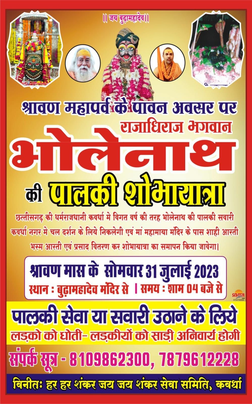 कवर्धा – छत्तीसगढ़ की धर्मनगरी कवर्धा में श्रावण मास के दिन सोमवार दिनांक 31 /07/2023 को मध्यान्ह 4 बजे भगवान भोलेनाथ की पालकी यात्रा बुढामहादेव मंदिर कवर्धा से निकलकर यूनियन चौक, स्वामी करपात्री पार्क, सराफा लाईन, ऋषभदेव चौक, महावीर स्वामी चौक, गुरु गोविन्द सिंह चौक, रमन मेडिकल, सिग्नल चौक होते हुवे भारतमाता चौक, महामाया मंदिर में समापन होगा उमंग पांडेय ने बताया भारत माता चोक में भगवान भोलेनाथ की भव्य महाआरती एवम् भस्म आरती श्री शंकराचार्य जनकल्याण न्यास के मुख्य प्रबंध ट्रस्टी एवम् सी ई ओ ज्योतिर्मठ. चंद्रप्रकाश उपाध्याय जी द्वारा किया जायेगा उक्त यात्रा में महिलाओ के द्वारा कलश यात्रा एवम् धुमाल डीजे बैगा नृत्य भजन कीर्तन के साथ निकलेगी यह आयोजन कवर्धा नगर में द्वितीय बार उमंग पांडेय एवं सौरभ शर्मा योगेश चंद्रवंशी राहुल ठाकुर लोकनाथ देवागन सागर साहू तमन्ना मेहरा के प्रयास से हर हर शंकर, जय जय शंकर सेवा समिति द्वारा किया जा रहा है जो कि अब निरंतर हर वर्ष किया जायेगा उक्ताशय की जानकारी नगर पालिका परिषद् के नेता प्रतिपक्ष श्री उमंग पांडेय ने दिया !Post navigationअवैध 5 लाख रुपया मांग पुरा नही होने पर फर्जी मामलों में फंसाने का साजिश बताया इमरान खान! छत्तीसगढ़ शालेय शिक्षक संघ की कवर्धा ब्लॉक कार्यकारिणी का हुआ पुनर्गठन, रामाश्रय, मोनिका उपाध्यक्ष व तुषार बने सचिव