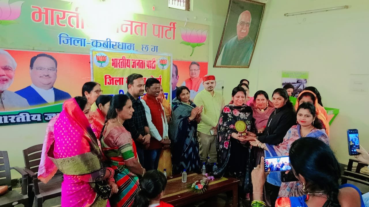 कवर्धा. भारतीय जनता पार्टी के केंद्रीय नेतृत्व के आह्वान पर एवं भाजपा जिला अध्यक्ष आदरणीय अशोक साहू जी के निर्देशन में भाजपा जिला महिला मोर्चा द्वारा उत्कृष्ट प्रतिभा सम्मान का कार्यक्रम रखा गया . जिसमे समाज क्षेत्र की ऐसी बहनों और बेटियों, जिन्होंने किसी भी खेल में नेशनल अवार्ड जीता हो, उनका सम्मान किया गया तथा महिला मोर्चा द्वारा उन्हें स्मृति चिन्ह प्रदान किए गए. जिला महिला मोर्चा अध्यक्ष सतविंदर पाहुजा ने बताया कि इस कार्यक्रम में नेशनल विनर रही चेतना देवलिया, छोटी मेहरा, अक्षरा नीलेश पवार,रंजीता धुर्वे, जानकी श्याम,शैली पाली तथा भगवातिन धुर्वे का सम्मान किया गया. इस कार्यक्रम में मुख्य रूप से उपस्थित संतोष पटेल , श्रीमती देवकुमारी चंद्रवंशी ,रुपेश जैन , उमंग पांडेय , मधु तिवारी , पूर्व जिला अध्यक्ष रति ठाकुर , विजय लक्ष्मी तिवारी , सुषमा चंद्रवंशी , शकुन जायसवाल श् नीतू शर्मा , महिला मोर्चा महामंत्री डॉ भारती गुप्ता ,महिला मोर्चा उपाध्यक्ष श्रीमती पुष्पा पाण्डेय , लता बेस, श्रीमती चेतना सिंह , श चंद्रलेखा वैष्णव , पूर्णिमा शर्मा , माया मेरावी , मण्डल अध्यक्ष संतोषी जायसवाल , अंजू शर्मा , दशरी ठाकुर , संगीता साहू मण्डल महामंत्री, ममता तिवारी , अनीता धुर्वे , वैध कुमारी चौबे एवं बहुत सारी संख्या मै महिला मोर्चा के पदाधिकारी उपस्थित हुए .Post navigationकलेक्टर ने ओलावृष्टि और बारिश से हुए फसलों की क्षति का सर्वे करने के निर्देश दिए *तपती धूप और नवरात्र उपवास के बीच खाली पैर जनता से लोकसभा में प्रधानमंत्री नरेंद्र मोदी के लिए आशीर्वाद माँग रही पंडरिया विधायक भावना बोहरा