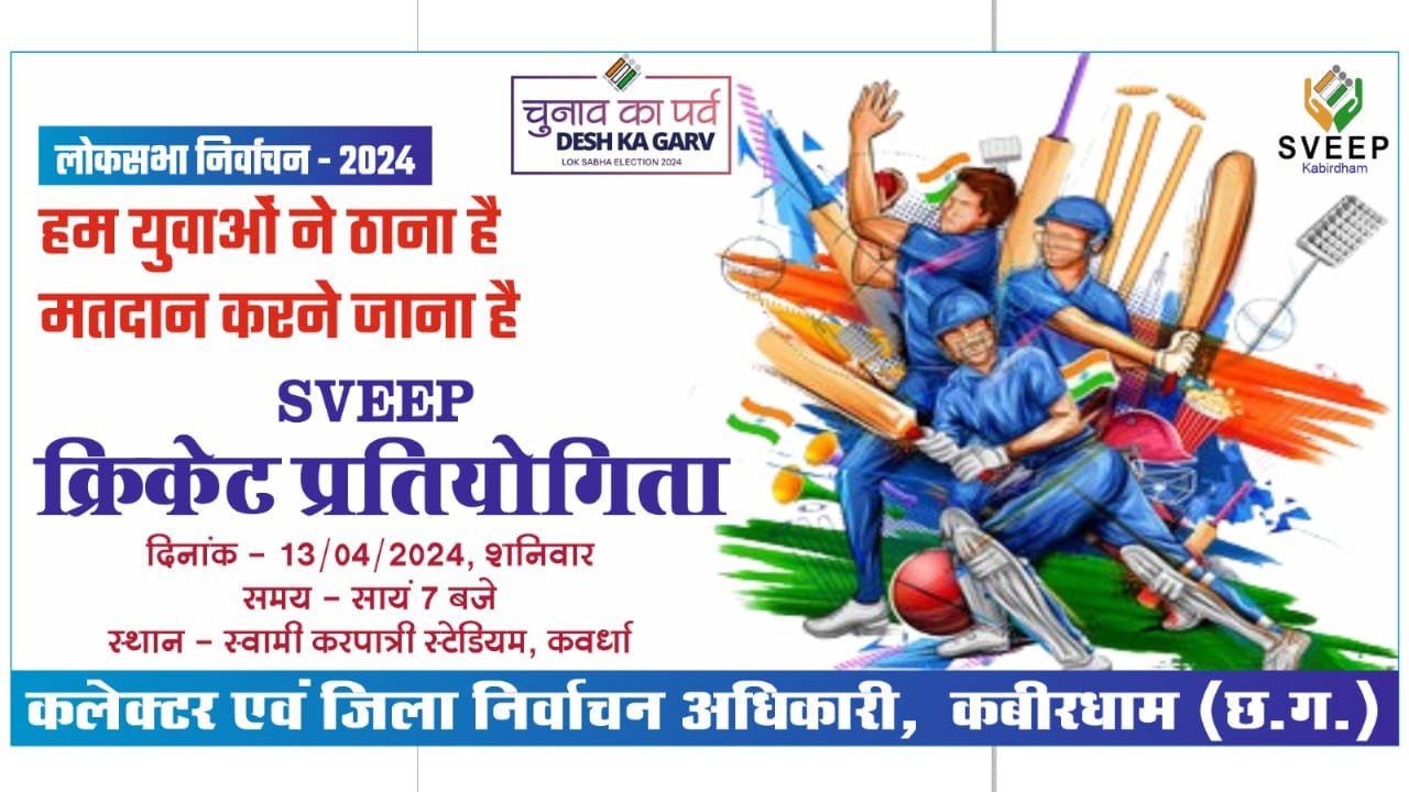 कवर्धा, 12 अप्रैल 2024। लोकसभा निर्वाचन 2024 के लिए जिले के संसदीय क्षेत्र राजनंदगांव के लिए 26 अप्रैल को मतदान किया जाना है। जिले में शत-प्रतिशत मतदान हो इसके लिए जिला निर्वाचन कार्यालय द्वारा लगातार विभिन्न कार्यक्रमों का आयोजन किया जा रहा है। इसी कड़ी में 13 अप्रैल की शाम 7 बजे से स्वामी करपात्री स्टेडियम कवर्धा में स्वीप क्रिकेट प्रतियोगिता का आयोजन किया गया है। इस प्रतियोगिता में जिले के वरिष्ठ अधिकारियों द्वारा क्रिकेट के पिच से मतदान करने का संदेश लोगो तक पहुंचा जाएगा।कलेक्टर एवं जिला निर्वाचन अधिकारी जनमेजय महोबे ने बताया कि चुनाव का पर्व देश का गर्व के बैनर तले लोकसभा क्षेत्र राजनांदगांव के लिए कबीरधाम जिले में शत-प्रतिशत मतदान करने का संकल्प लेकर जिला निर्वाचन कार्यालय द्वारा लगातार मतदाता जागरूकता अभियान चलाया जा रहा है। शहरी एवं ग्रामीण क्षेत्रों में विभिन्न कार्यक्रमों का आयोजन हो रहा है। इसी कड़ी में स्वीप क्रिकेट प्रतियोगिता का आयोजन किया जा रहा है जिससे कि जिले के युवाओं सहित सभी को मतदान करने के लिए प्रेरित किया जा सके। मुख्य कार्यपालन अधिकारी जिला पंचायत कबीरधाम संदीप कुमार अग्रवाल ने बताया कि मतदाता जागरूकता अभियान के अंतर्गत क्रिकेट प्रतियोगिता आयोजित होगा।इस दौरान उपस्थित सभी लोगों को संबोधित करते हुए मतदान के लिए प्रेरित किया जाएगा एव सभी को करना है मतदान का संदेश दिया जाएगा।Post navigationनिर्वाचन कार्य को संपन्न कराने गंभीरतापूर्ण प्रशिक्षण प्राप्त करना जरूरी-कलेक्टर जनमेजय महोबे यात्री बसों पर परिवहन विभाग की लगातार कार्यवाही जारी, 15 बसो पर मोटरयान अधिनियम के तहत की गई कार्यवाही